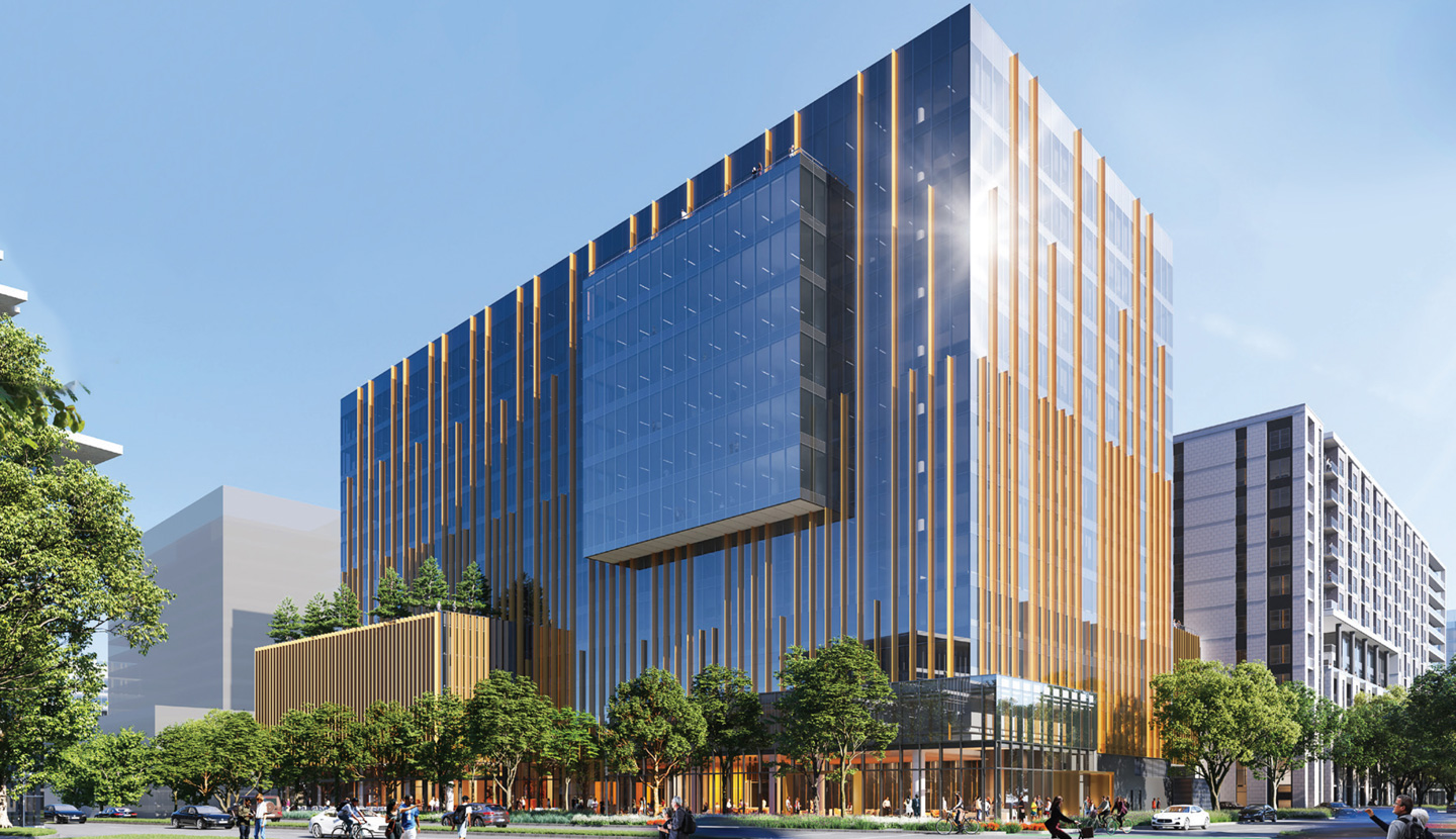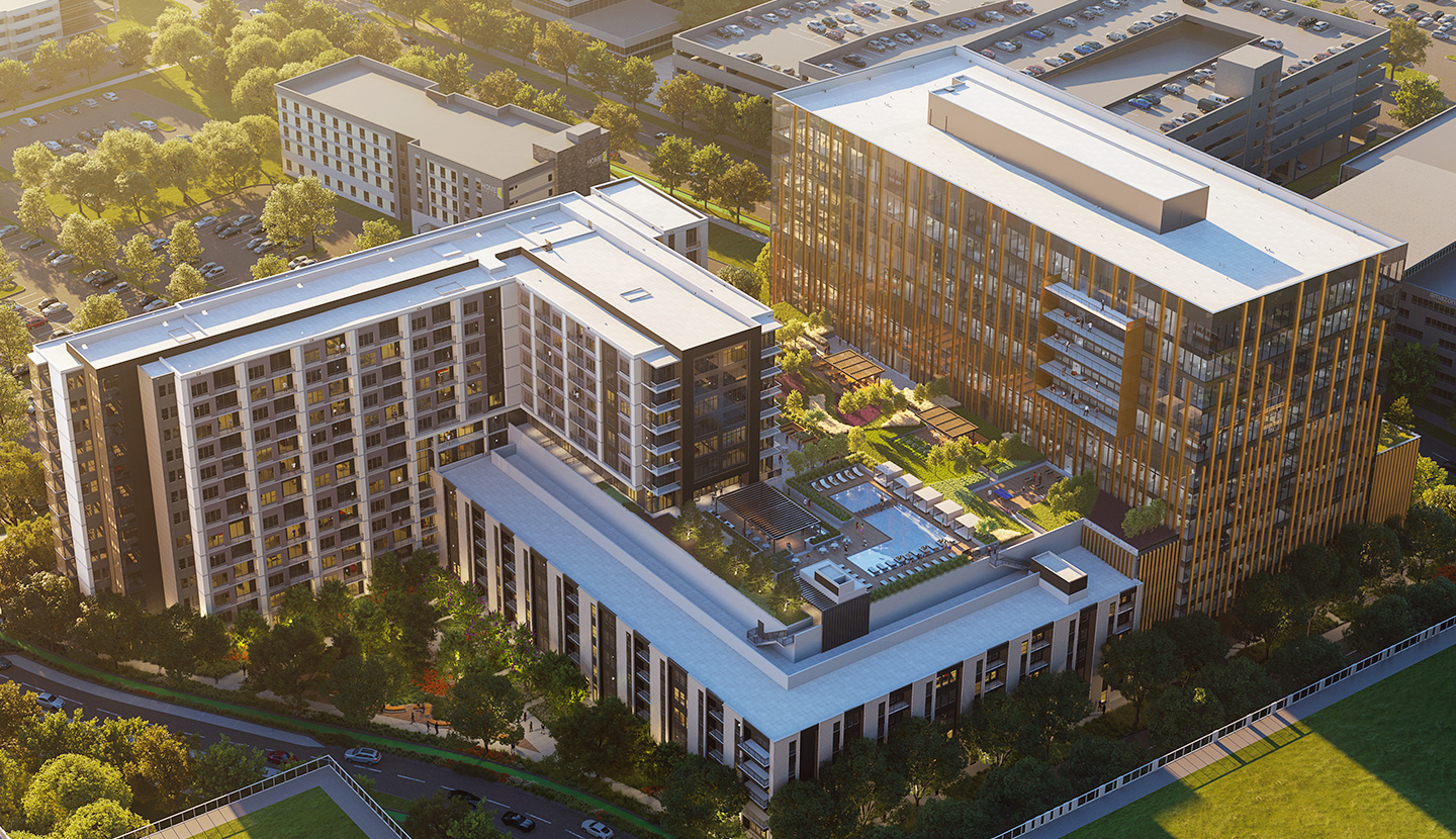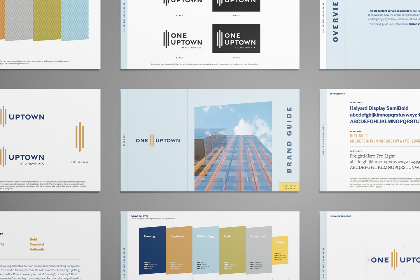 Our logo includes a mark derived from the unique vertical frits or spines on the building’s exterior. They represent upward movement, literally and figuratively. Our brand palette is inspired by the integrated natural elements inherent in the design of the property, including sky, sunlight and greenery.